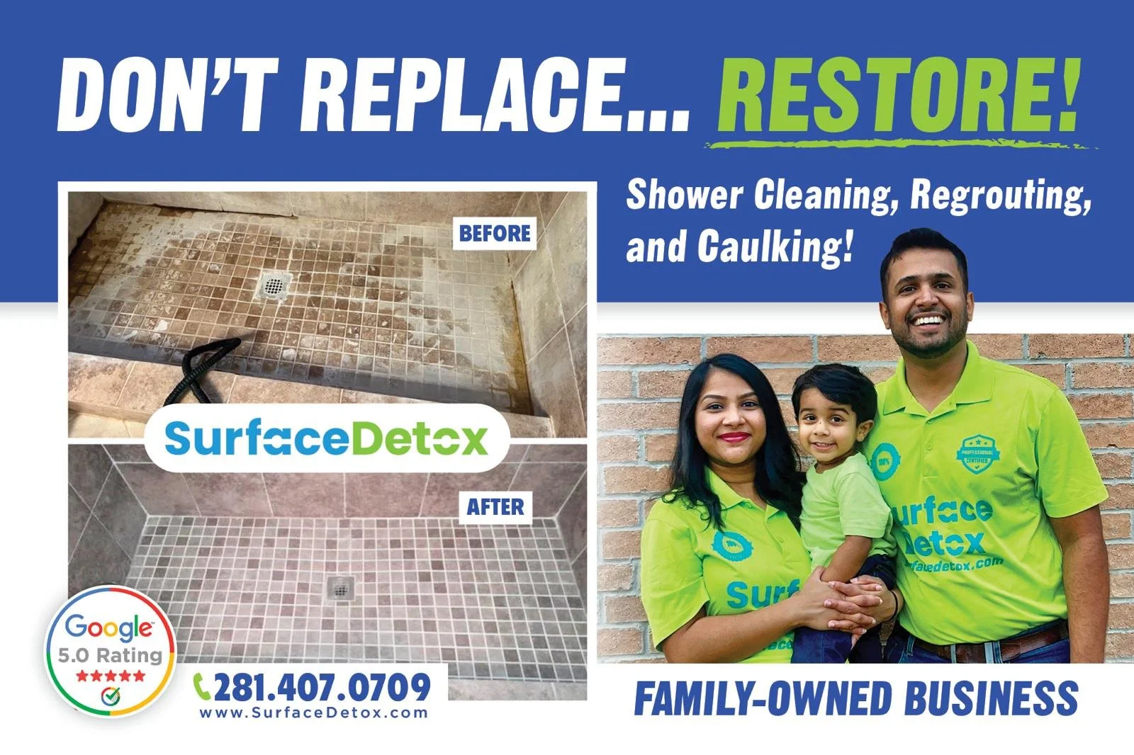 To get an estimate for shower cleaning, grout repair, or re-caulking, please take a picture with your phone and text us photos of your shower. We need a picture of the entire shower to see its size, as well as close-up pictures of the walls, floor, and any areas of concern.